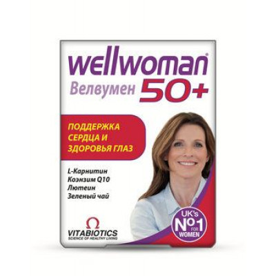 Комплекс витаминов из Англии для удовлетворения особых потребностей женщины после 50 лет. Велвумен 50+ содержит полный набор из 22 витаминов, минералов, полезных кислот для поддержки ключевых областей здоровья женщины старше 50 лет, включая здоровье сердца, мозга и глаз.